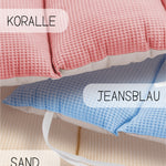 • Kissen mit Wendeoptik: Auf der Vorderseite flauschiges Waffelpiqué (Farbe wählbar), auf der Rückseite Baumwolle in dezentem hellgrau.