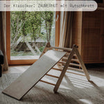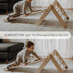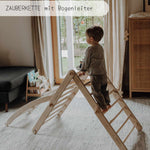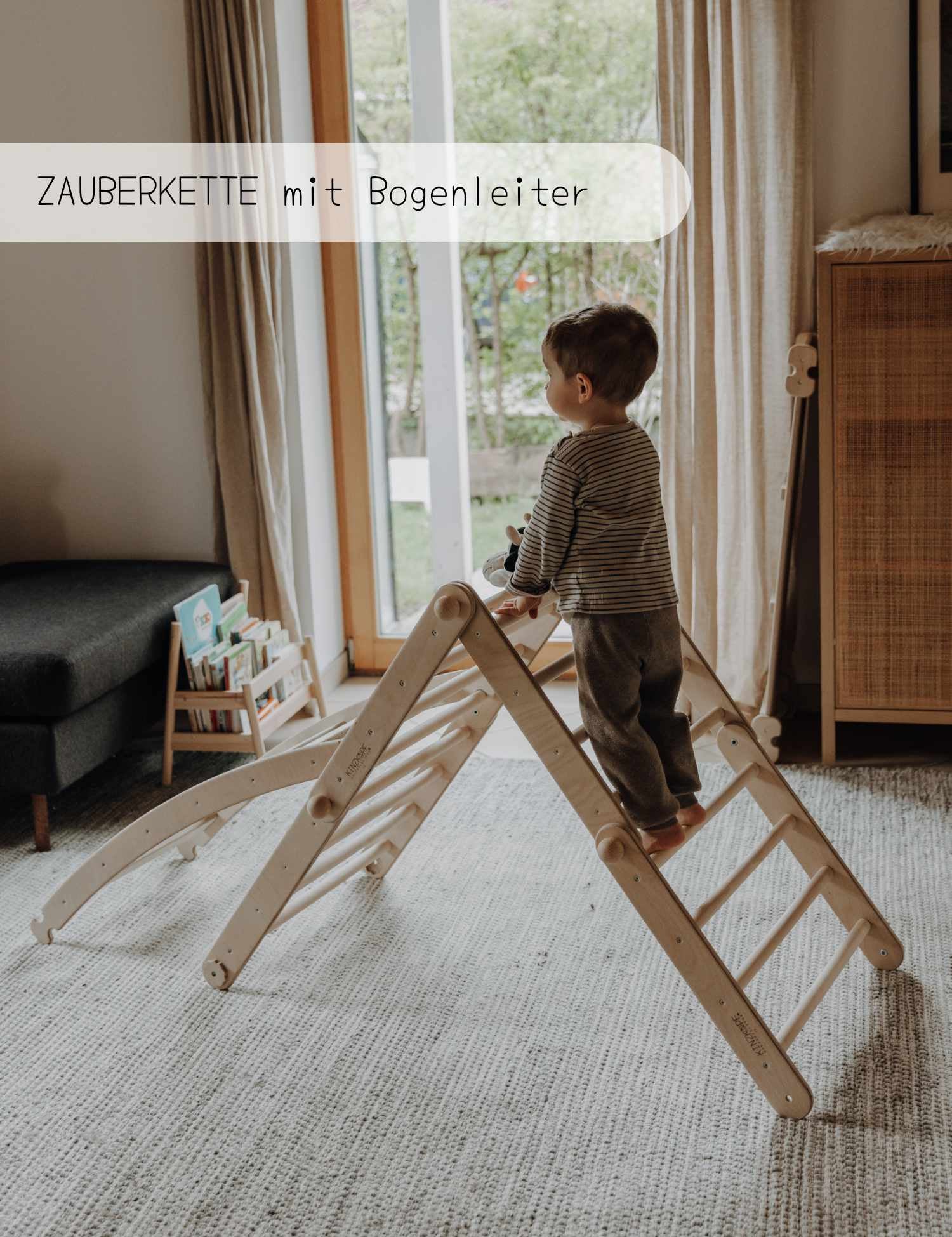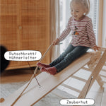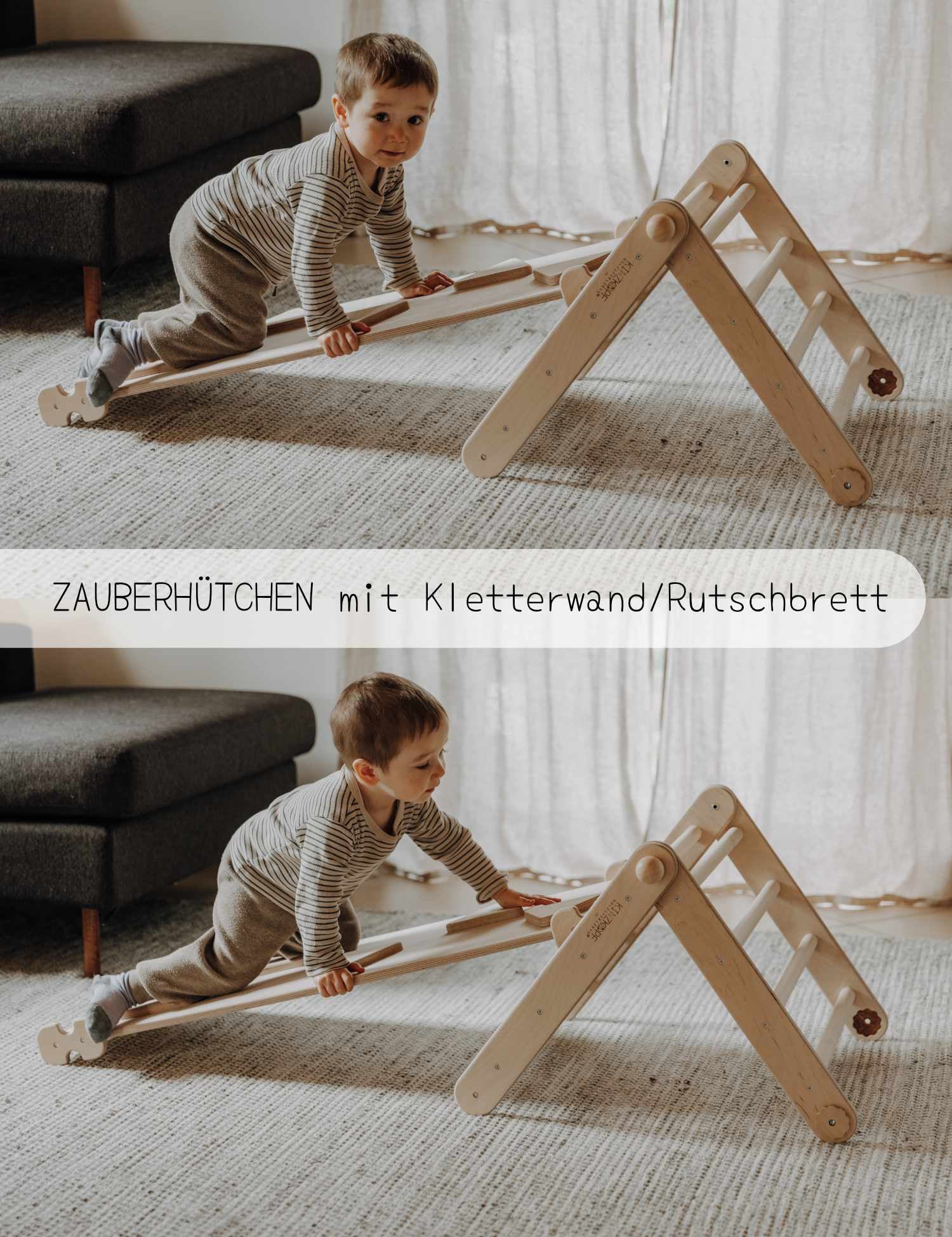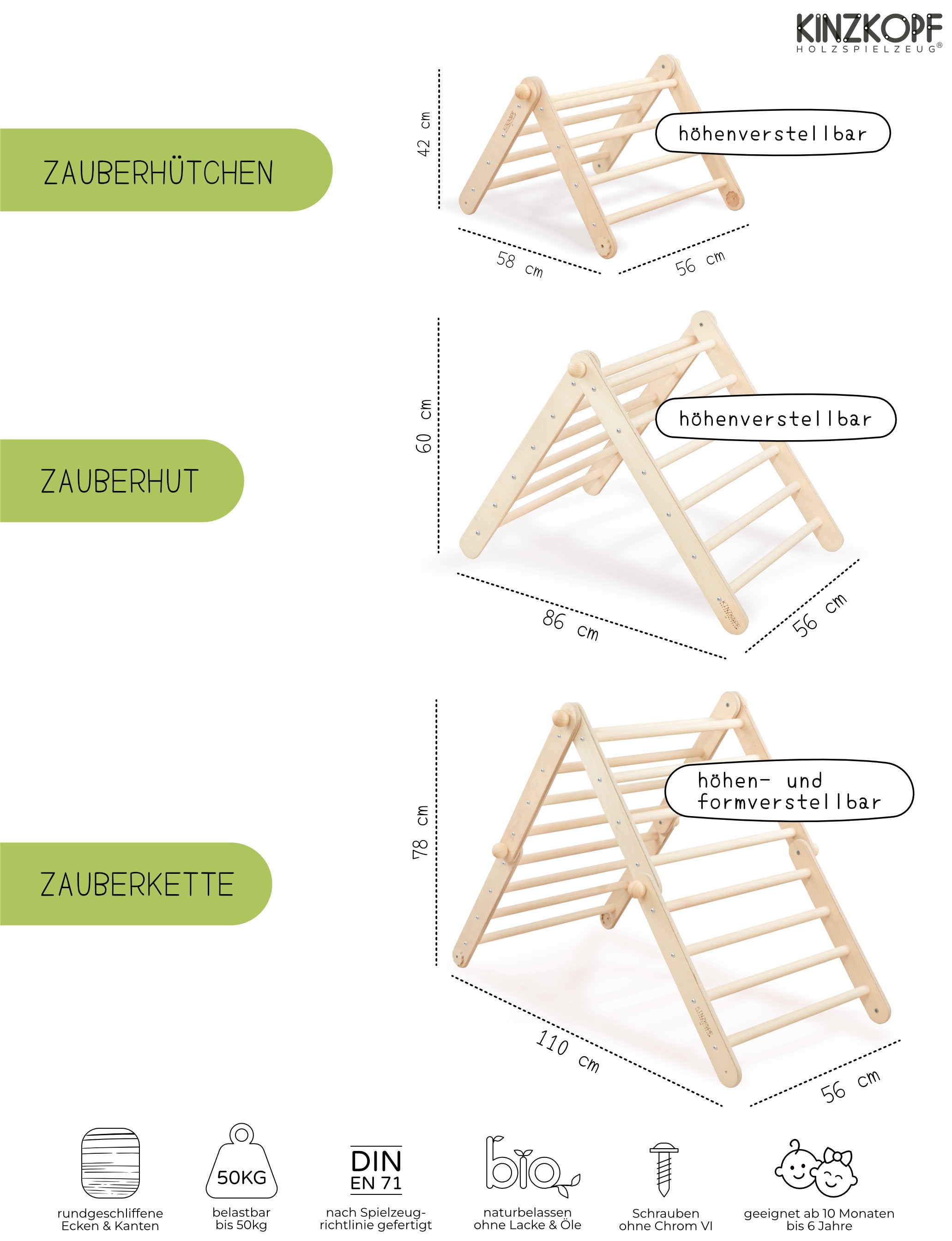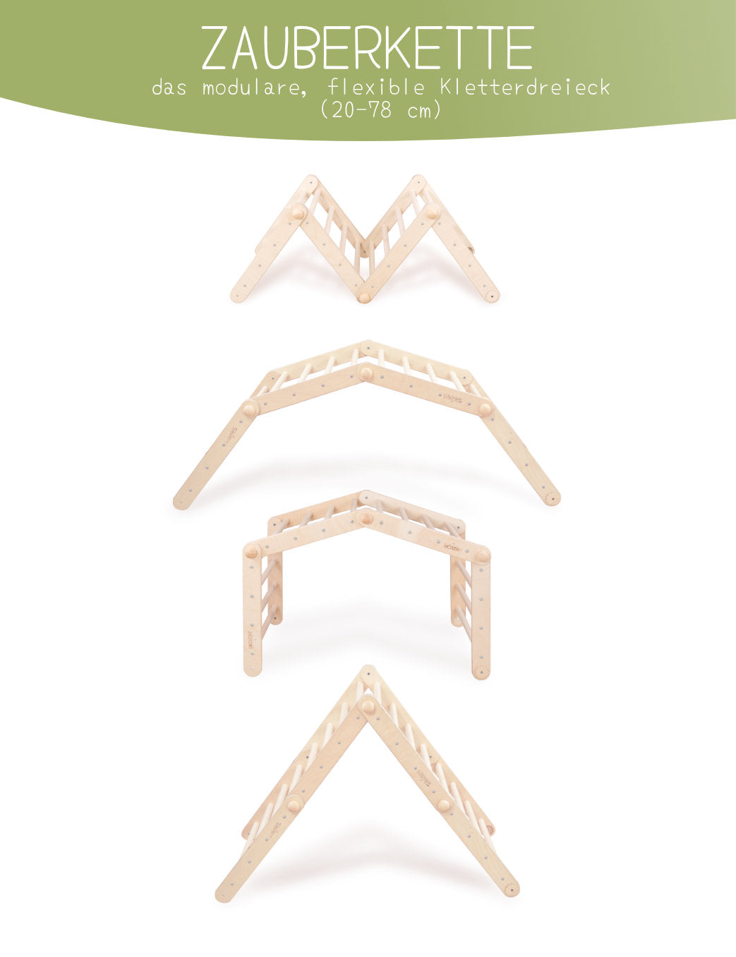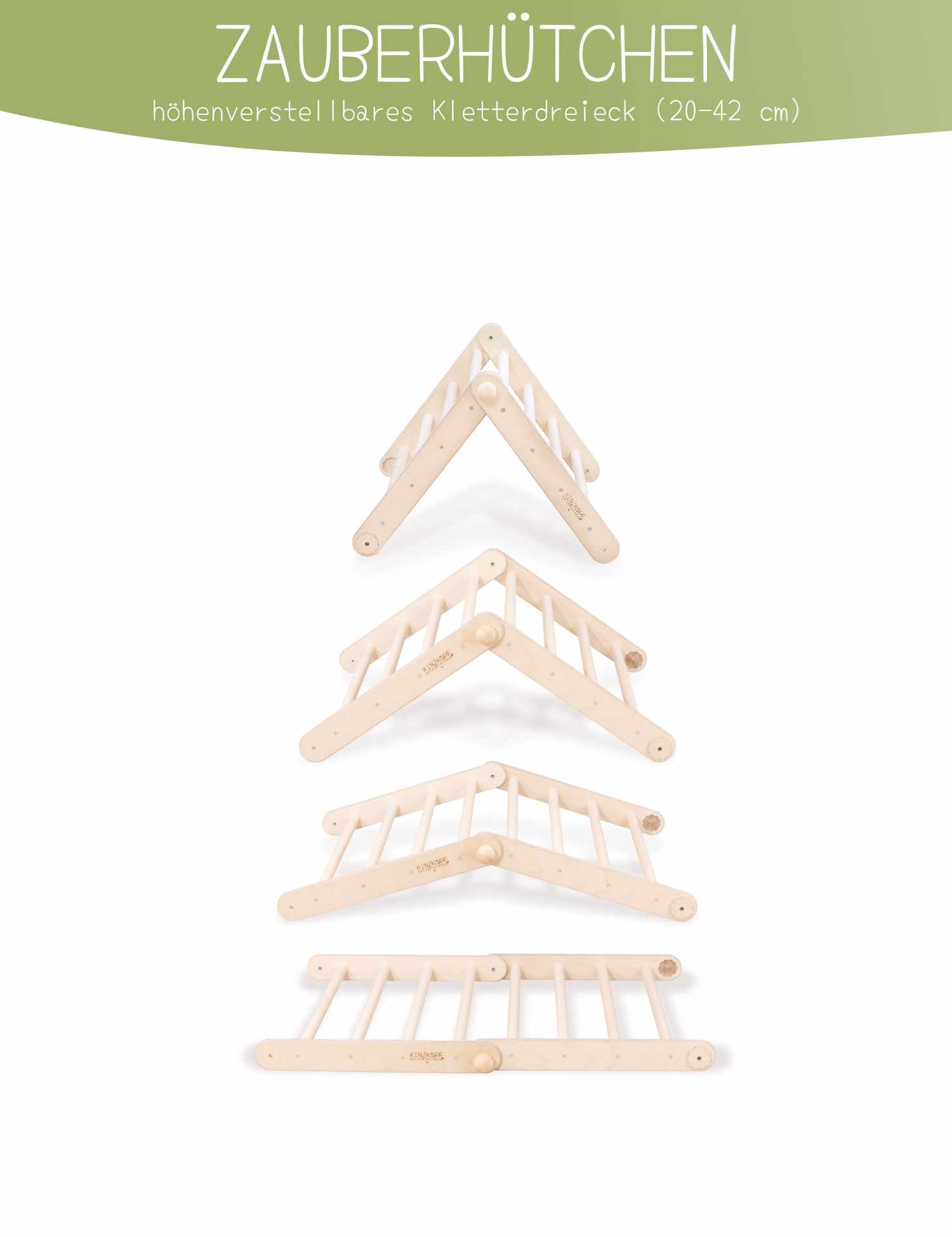 ZAUBERHÜTCHEN: das kleine Pikler-Dreieck; um weitere Kletterbeine erweiterbar. Höhenverstellbar von 20 bis 42 cm.